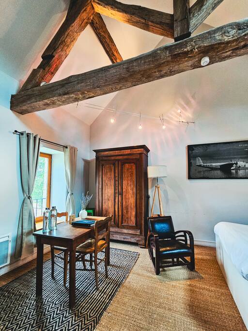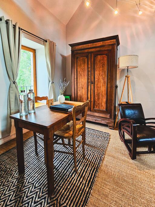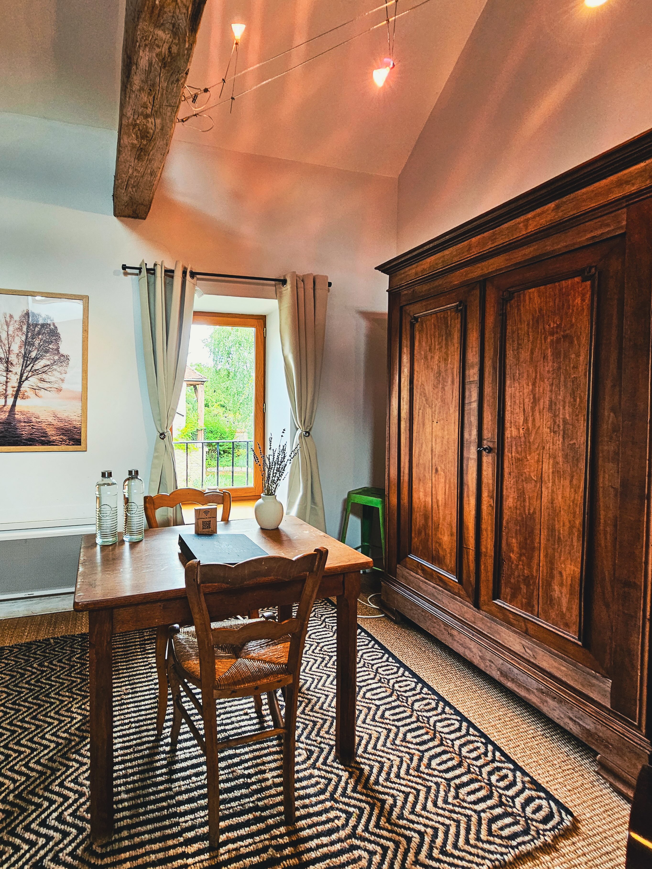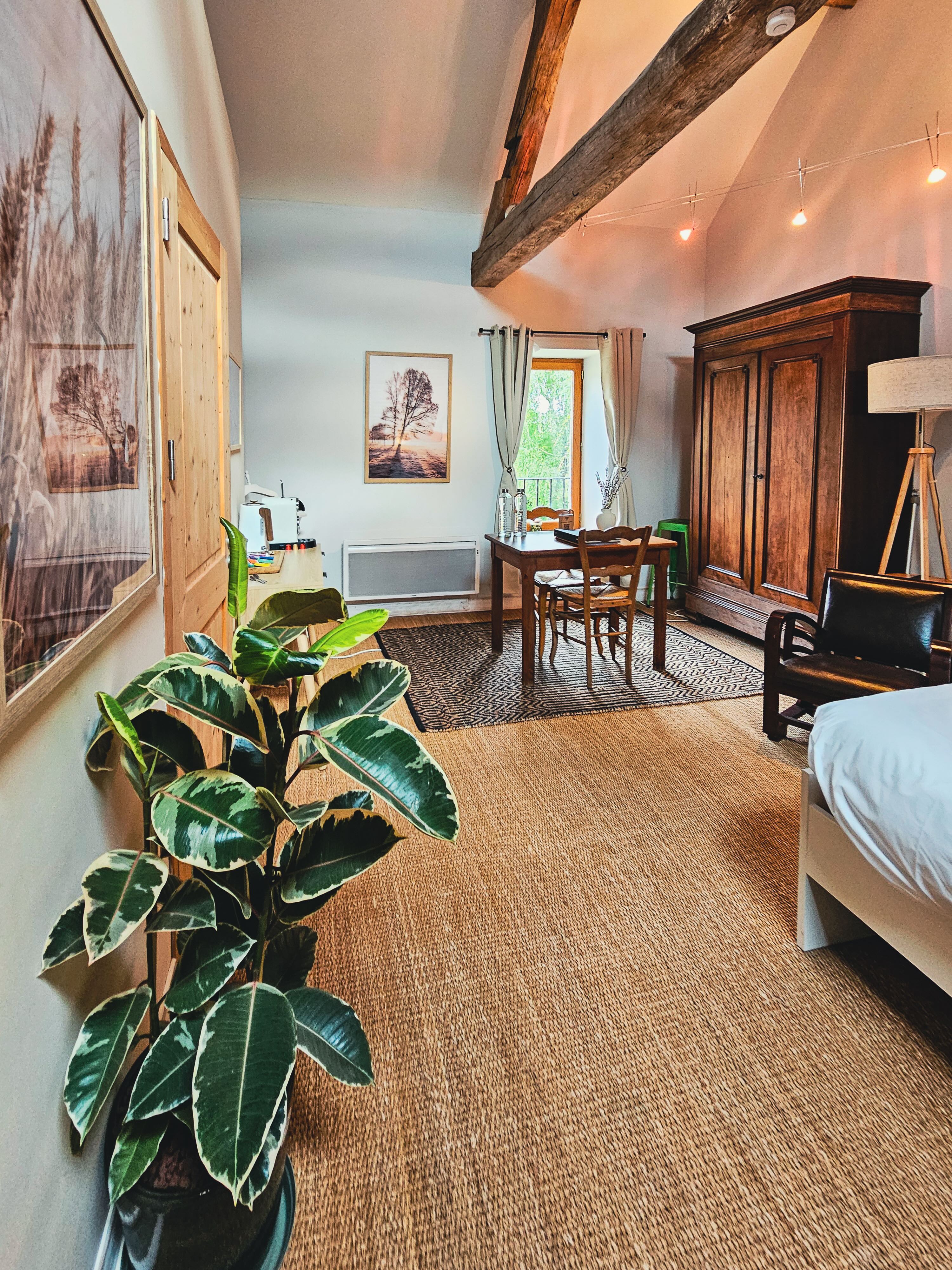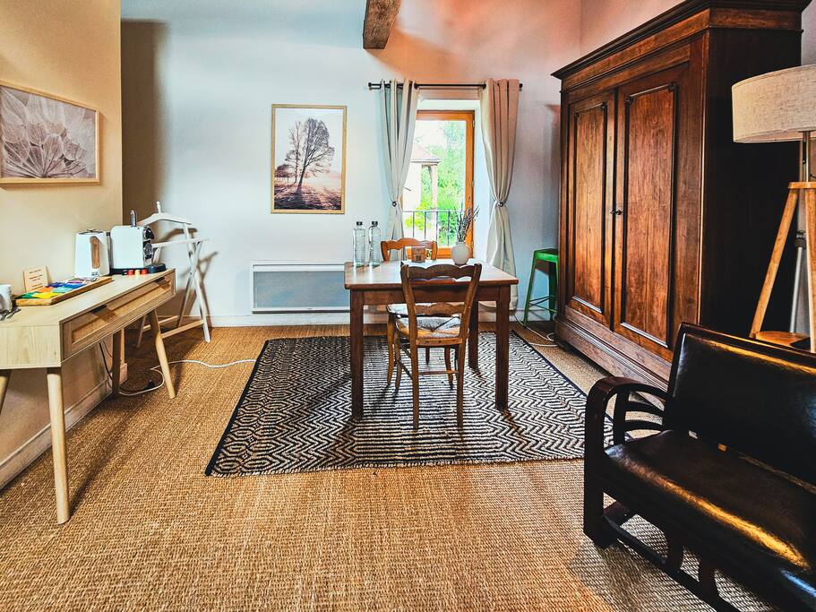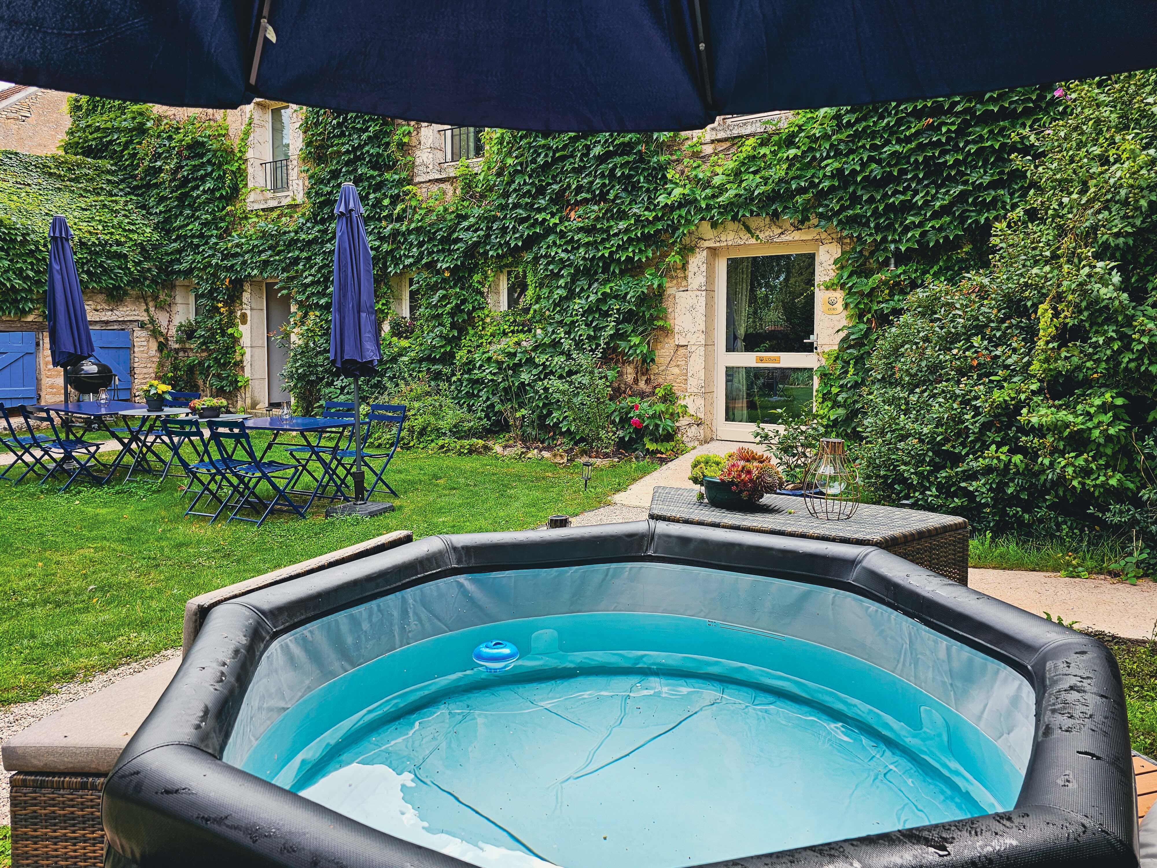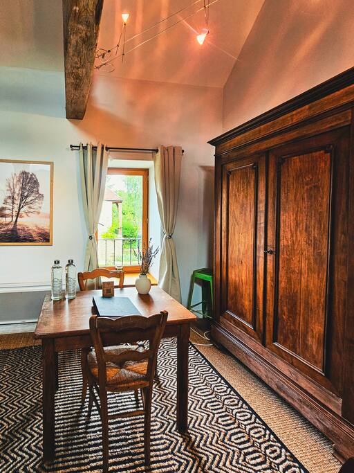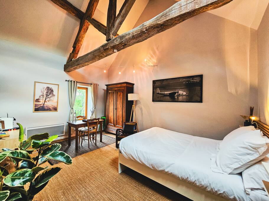 This bright upstairs room looks straight out over the garden, with a private ensuite and a bit of extra space for small families. With full access to the yard and shared Jacuzzi—plus breakfast spots and castles a short drive away—this is a peaceful, charming spot for exploring Noyers and the surrounding areas.